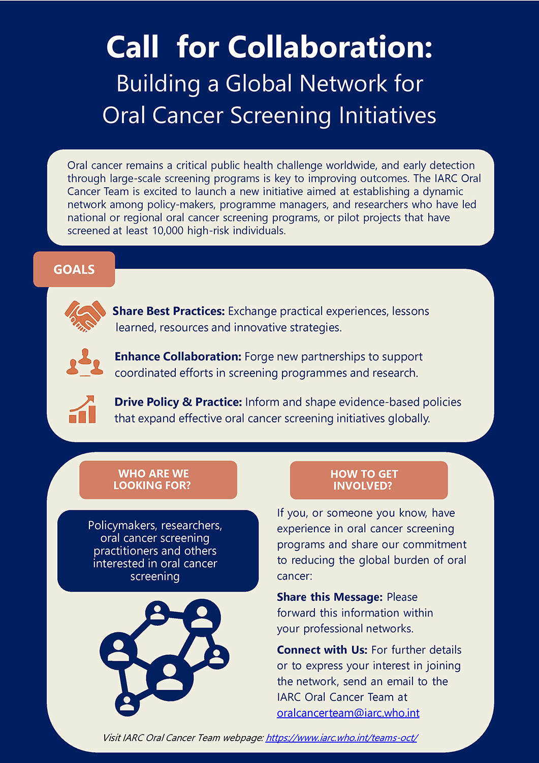 To express interest in joining the network or to request further information, contact the IARC Oral Cancer Team at oralcancerteam@iarc.who.int.
