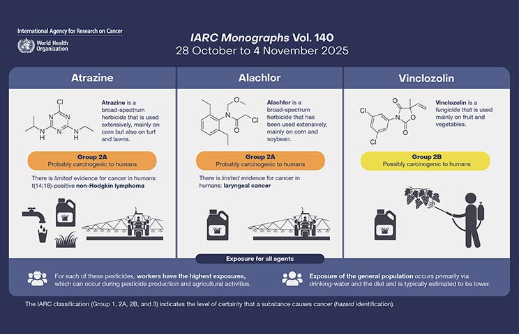 The results of the recent IARC Monographs evaluation of three pesticides – the herbicides atrazine and alachlor and the fungicide vinclozolin – have now been published in The Lancet Oncology. The summary article presents the conclusions of IARC Monographs Meeting 140.
