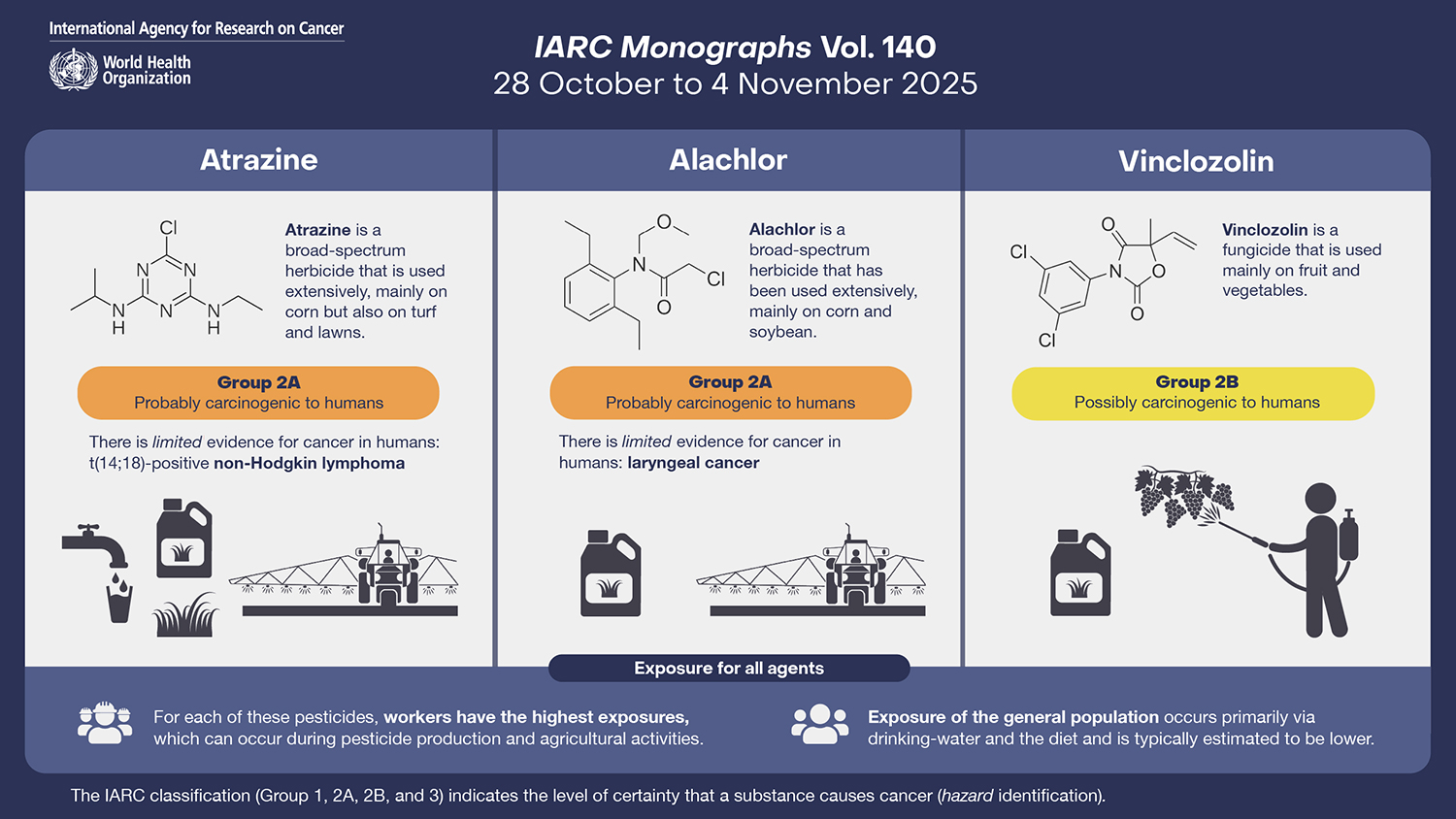 Atrazine was previously evaluated by the IARC Monographs programme in 1998 in Volume 73. Alachlor and vinclozolin were evaluated for the first time.