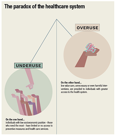 The landscape of cancer is largely shaped by social structures and inequalities and by the organization and inefficiencies of health systems. This context reveals a paradox: that too little care co-exists with too much care, even within the same population.